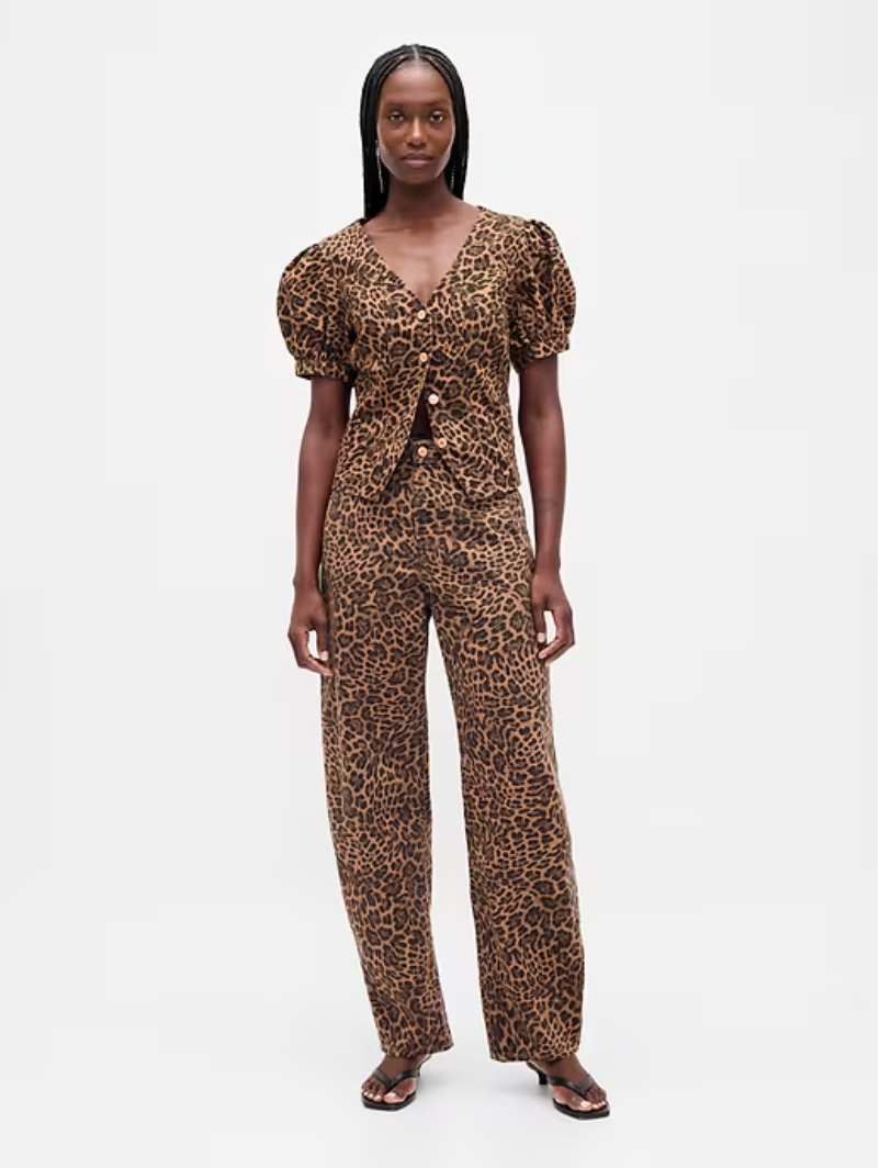 Gap Leopard High Rise Barrel Jeans and Puff-Sleeve Seamed Top